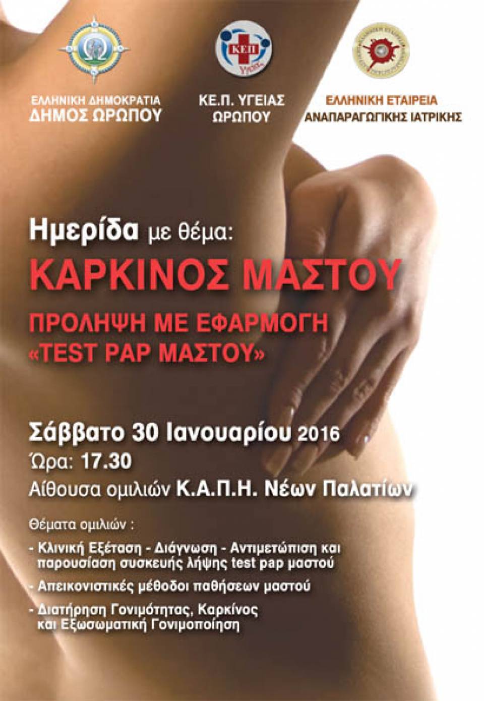 Μέσα σ' αυτά τα πλαίσια της ενημέρωσης θα πραγματοποιηθεί εκδήλωση της Ελληνικής Εταιρείας Αναπαραγωγικής Ιατρικής, σε συνεργασία με το Δήμο Ωρωπού και τα ΚΕΠ Υγείας Ωρωπού, στην αίθουσα ομιλιών Κ.Α.Π.Η. Νέων Παλατίων (Μάρμαρα 31,Νέα Παλάτια Ωρωπού- Τηλ:22950-30004) με θέμα “Καρκίνος Μαστού- Πρόληψη με εφαρμογή test pap μαστού” το Σάββατο, 30 Ιανουαρίου 2016 και ώρα 17:30.