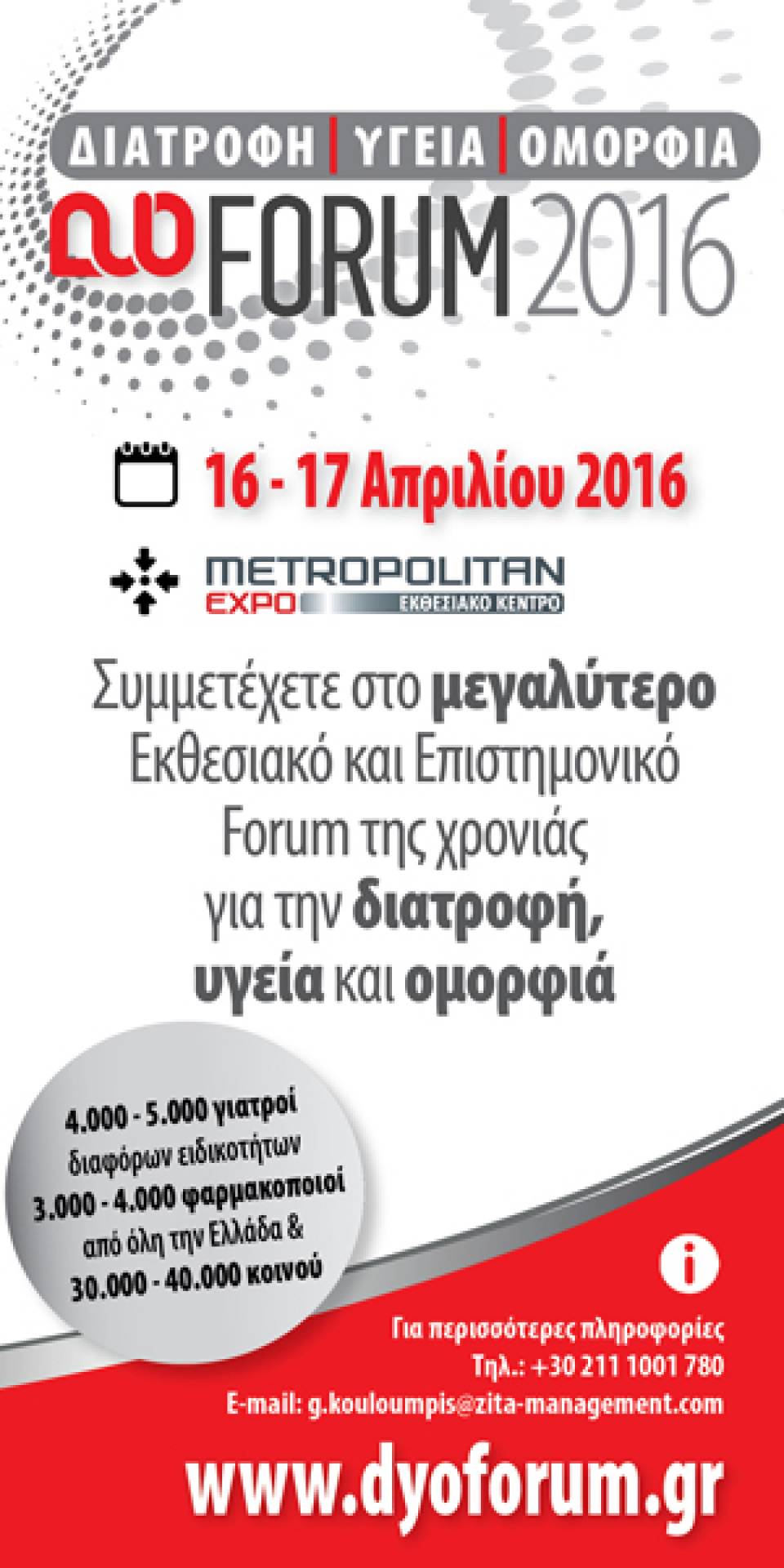 Το περιοδικό ΔΥΟ διοργανώνει το μεγαλύτερο και πληρέστερο FORUM, που έχει γίνει ποτέ στην Ελλάδα, για τους κλάδους της διατροφής, της υγείας και ομορφιάς στις 16 και 17 Απριλίου 2016 στο Metropolitan EXPO.